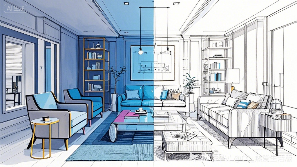 一个客厅室内的设计蓝图,CAD 风格,铅笔素描效果,详细测量和标记注释,纯白色背景,黑线,关键部件上的微妙色彩…
